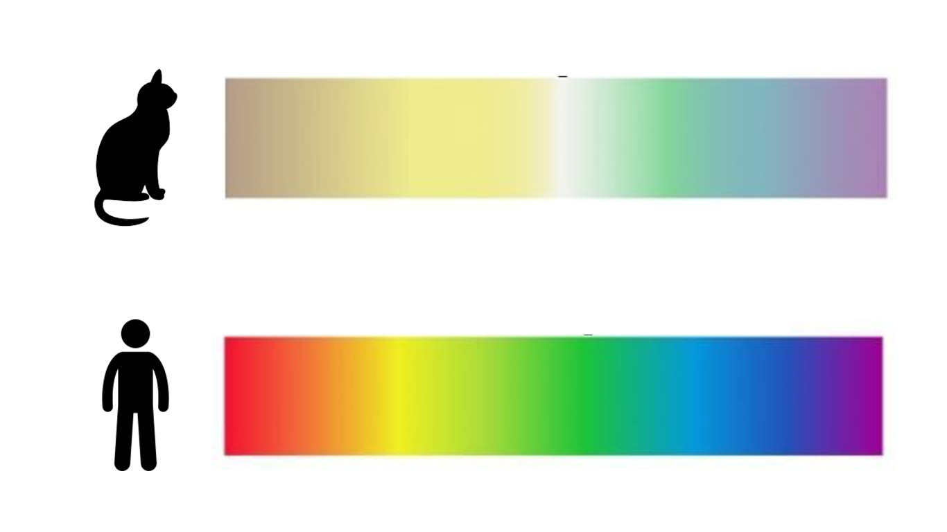 - The cat color spectrum appears more muted compared to the vibrant colors humans see.