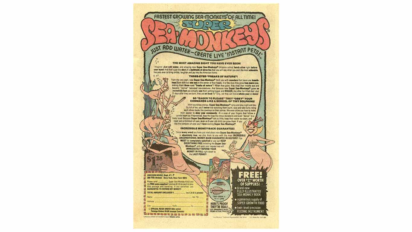 | Sea Monkeys | Aquatic pets that promised to grow into a “family of lovable creatures” and provide hours of entertainment. |