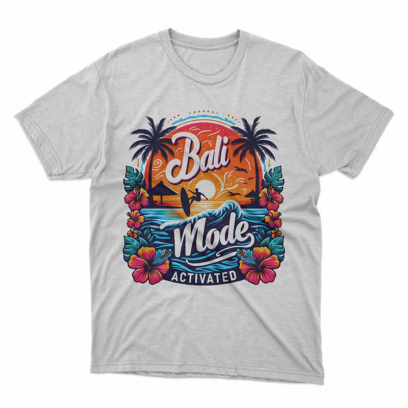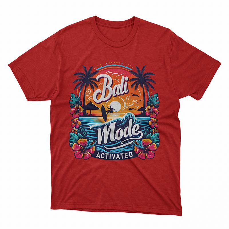 Step into paradise with our “Bali Mode Activated” T-Shirt, the ultimate Bali T Shirt designed for those who crave the tropical vibes of this island paradise. This Bali T Shirt captures the essence of sun, surf, and relaxation with its vibrant and detailed design featuring palm trees, hibiscus flowers, and a surfer riding the waves at sunset.