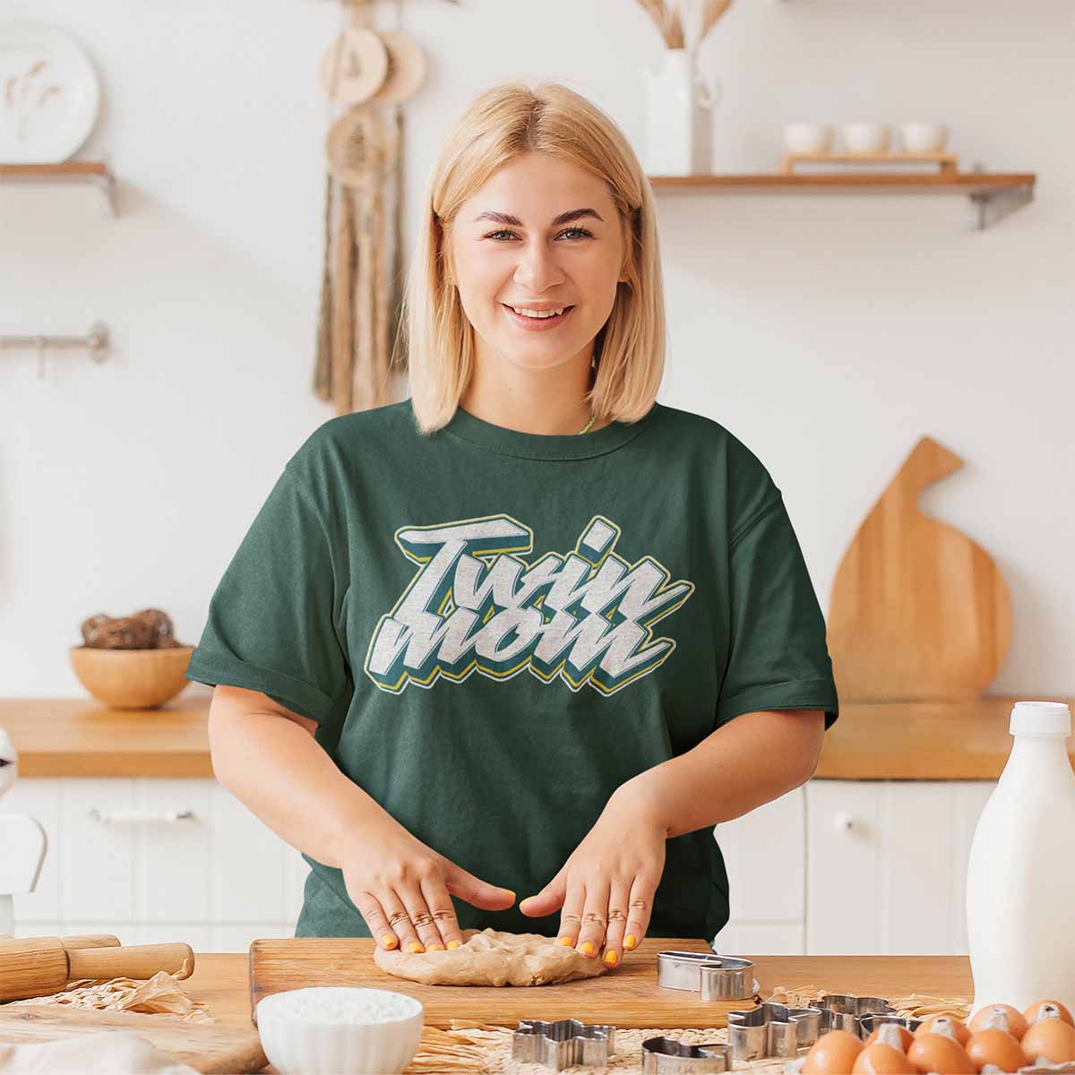 Crafted from soft, breathable cotton, this tee ensures comfort all day long. The classic fit and durable fabric make it perfect for daily wear, while the charming design adds a touch of personality to any outfit. The shirt features a delightful and eye-catching graphic that proudly declares “Twin Mom” in a stylish font, accentuated by adorable twin-themed illustrations.